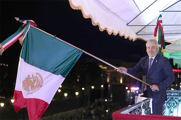 Para conmemorar el 214 de Aniversario del Inicio de la Independencia, en punto de las 22:30 horas, el mandatario estatal lanzó el tradicional ¡viva la Independencia de México!.
